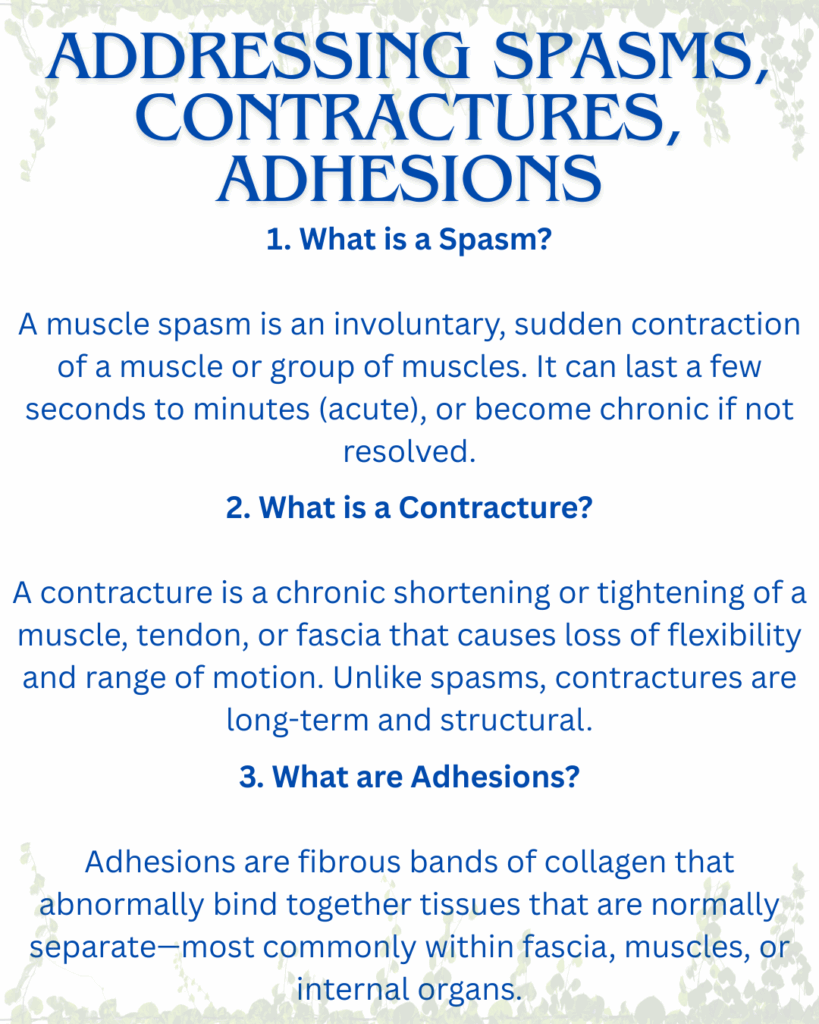 These three conditions—spasms, contractures, and adhesions—represent different ways the muscles, fascia, and connective tissue respond to injury, trauma, stress, or dysfunction. Each creates restriction, pain, and a loss of flow, but they originate from different processes. From a holistic perspective, they are not just mechanical—they reflect nervous system imbalances, emotional holding, and energetic stagnation.
