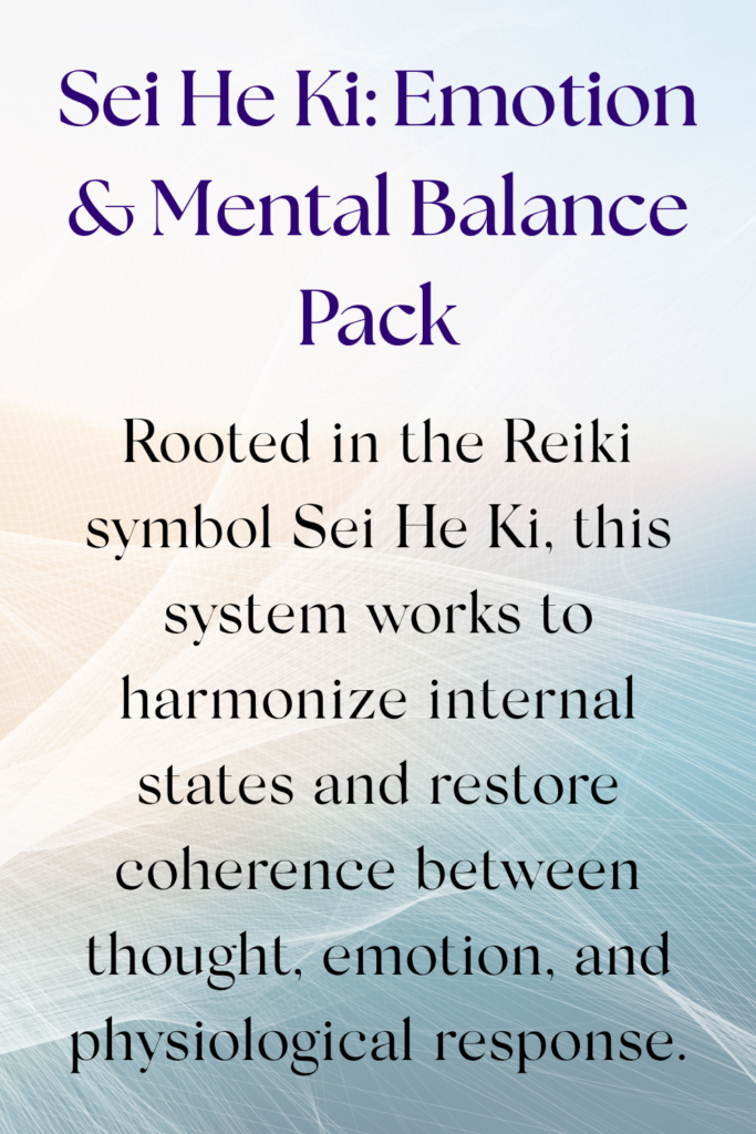The Sei He Ki Pack is designed to support emotional healing, mental clarity, and the integration of mind and body. Rooted in the Reiki symbol Sei He Ki, this system works to harmonize internal states and restore coherence between thought, emotion, and physiological response.