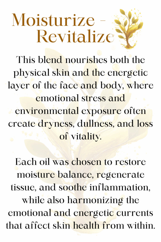 This blend nourishes both the physical skin and the energetic layer of the face and body, where emotional stress and environmental exposure often create dryness, dullness, and loss of vitality.