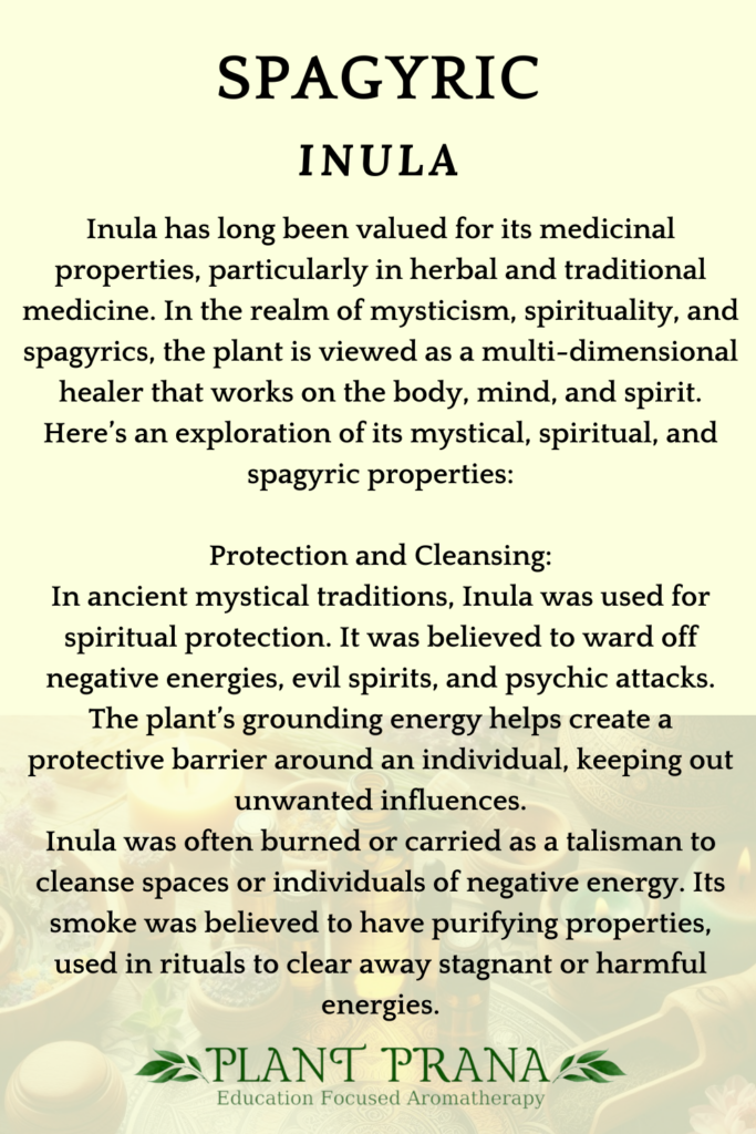 Inula has long been valued for its medicinal properties, particularly in herbal and traditional medicine. In the realm of mysticism, spirituality, and spagyrics, the plant is viewed as a multi-dimensional healer that works on the body, mind, and spirit. Here’s an exploration of its mystical, spiritual, and spagyric properties: